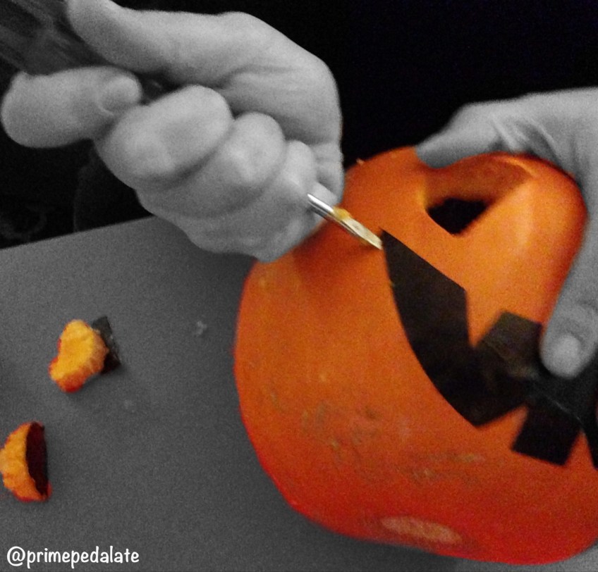 Grasp the knife like a pencil and hold it at a right angle to the pumpkin. Move it steadily up and down, working from dot to dot. When you are done, simply knock out the carved pieces and now trim up the edges, angles, corners and inside of the pumpkin with a knife.